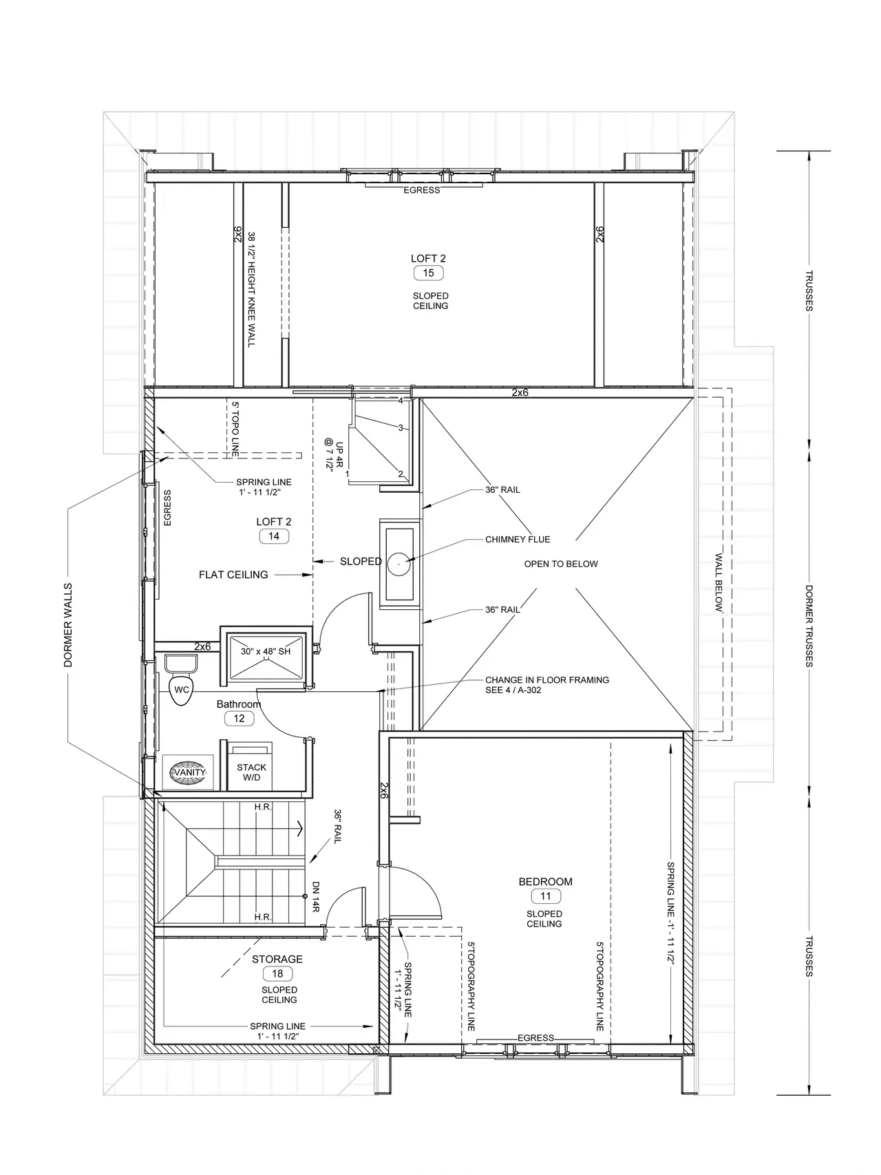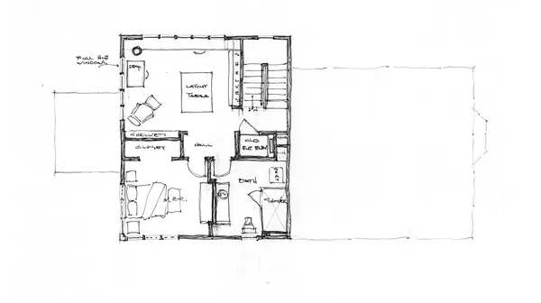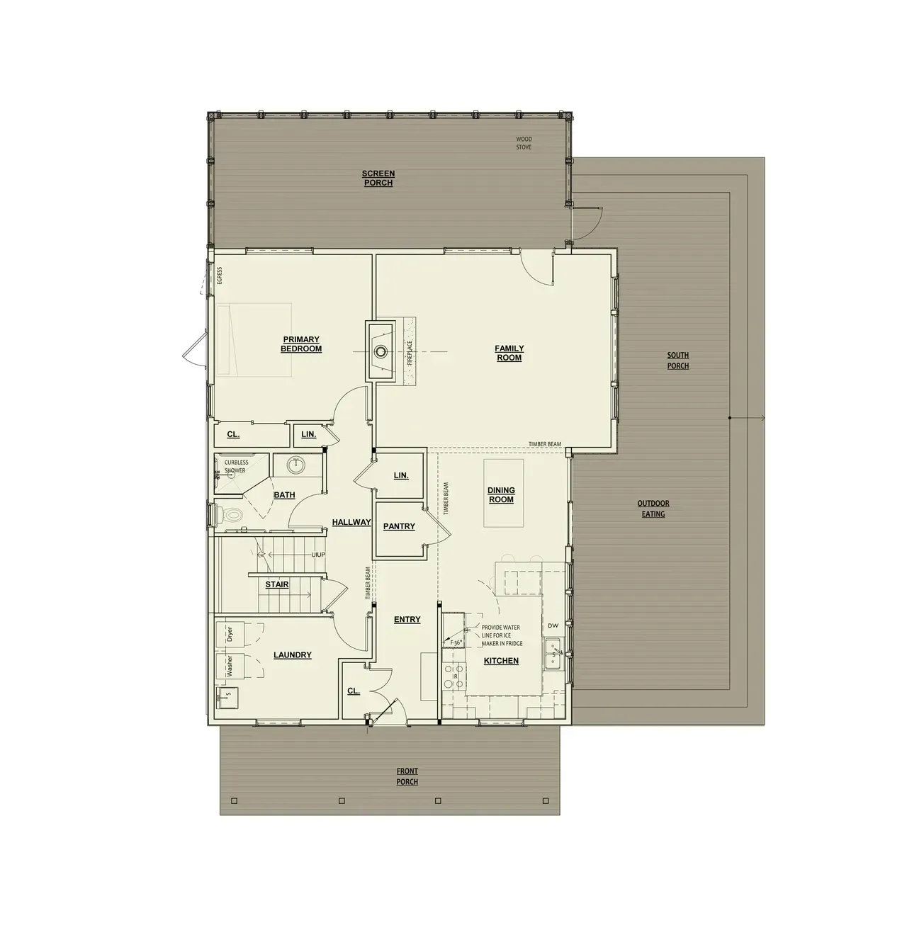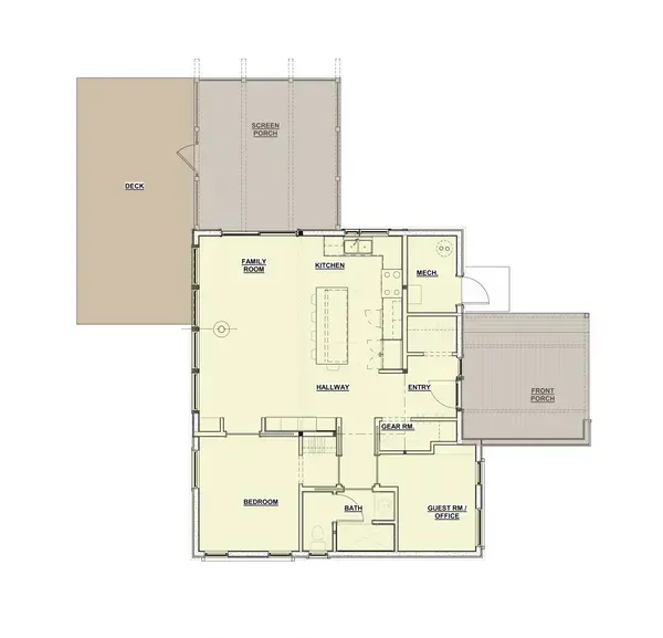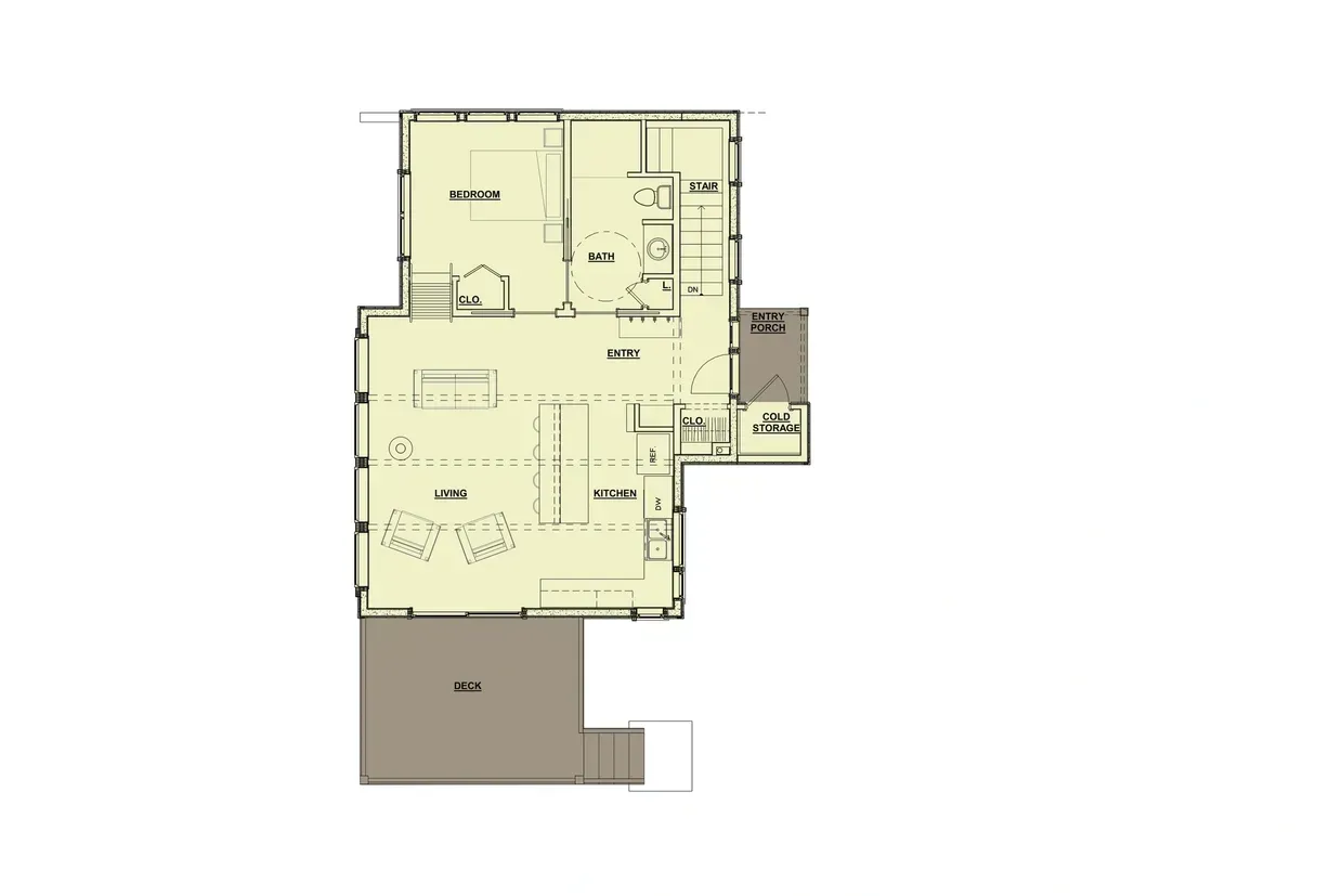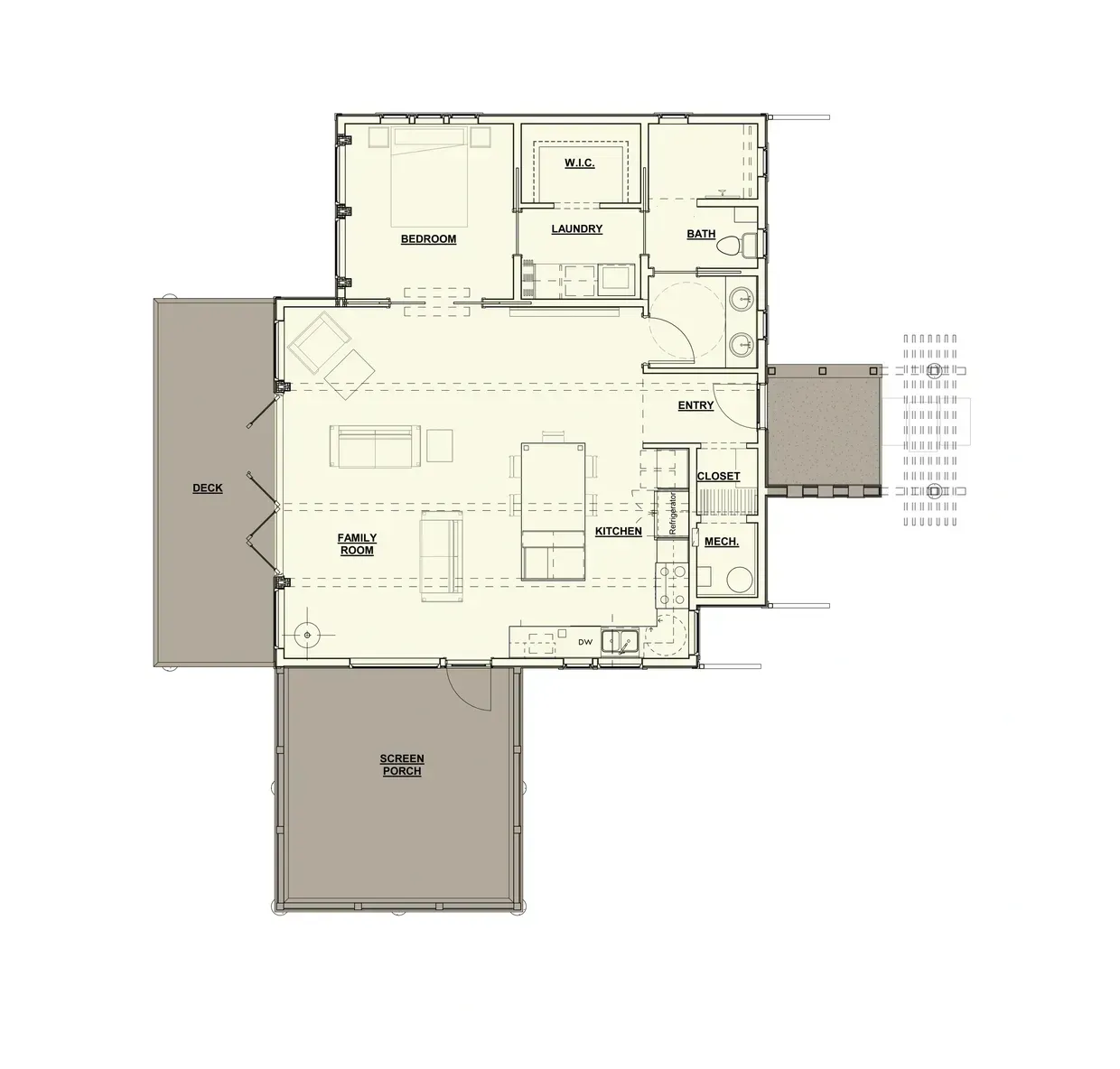 TAMARACK - Designed for a narrow lot, this classic Tamarack is complete with a kitchen, dining room, and living space, all on one level. A version of this was built with a master suite on the main level with additional guest rooms, another open area, and a private office up top.