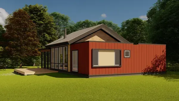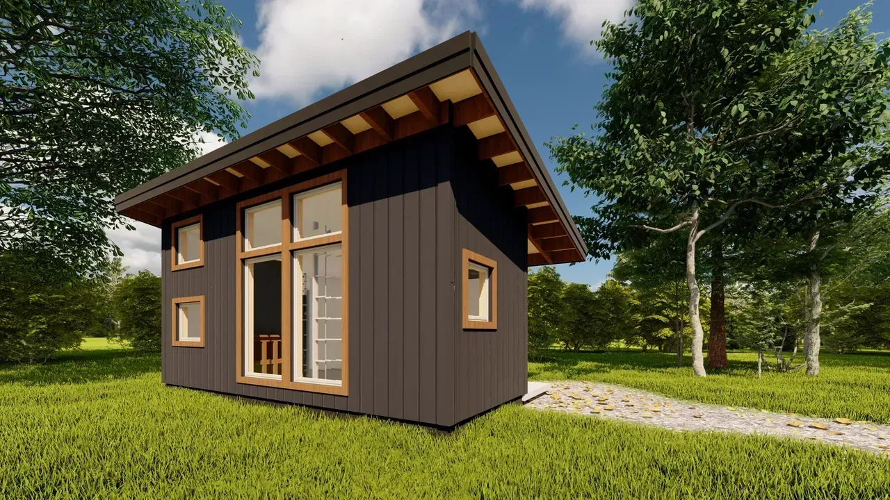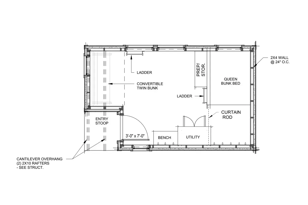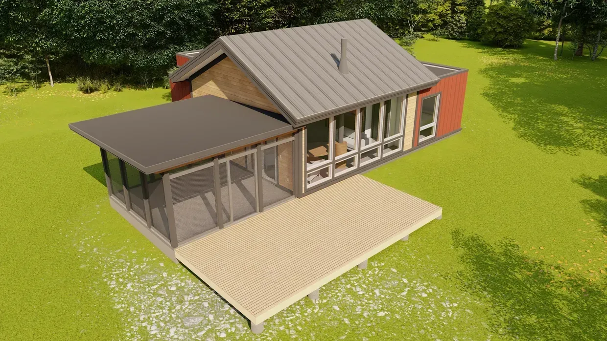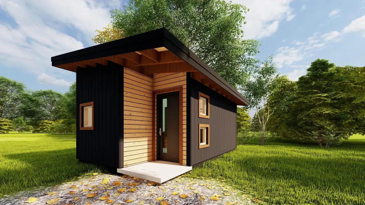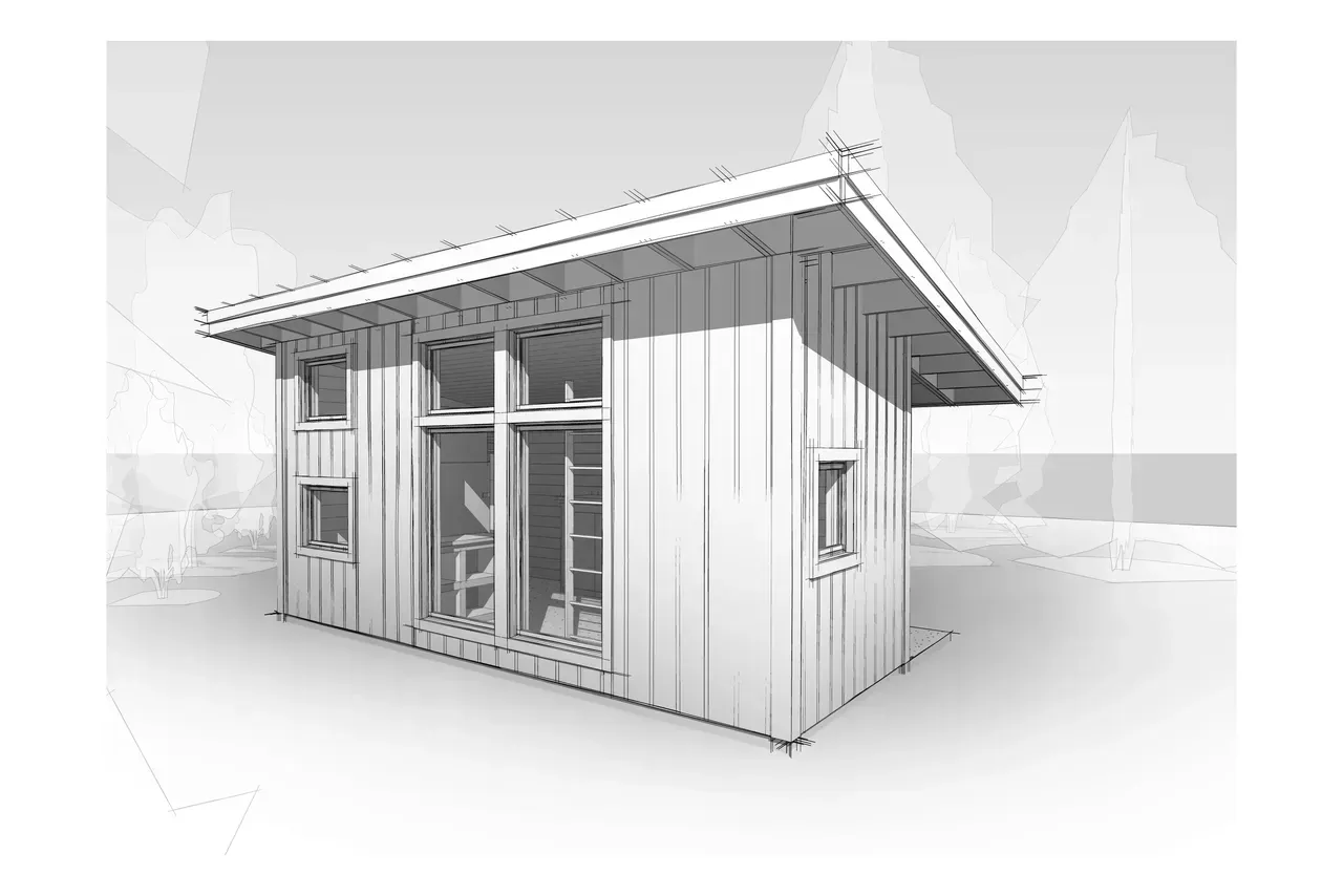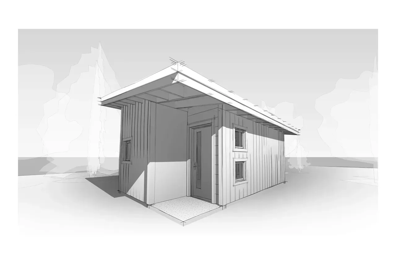 GUEST COTTAGE - Designed to be adjacent to a main cabin, this guest cottage features a one-room area for living and sleeping. It also includes a sink in the open space and an enclosed toilet shower room for privacy.