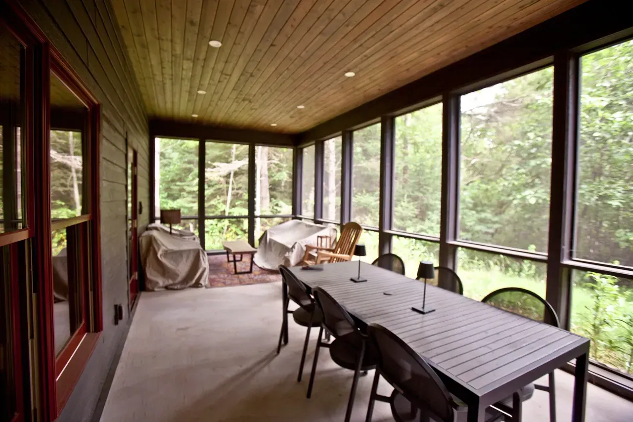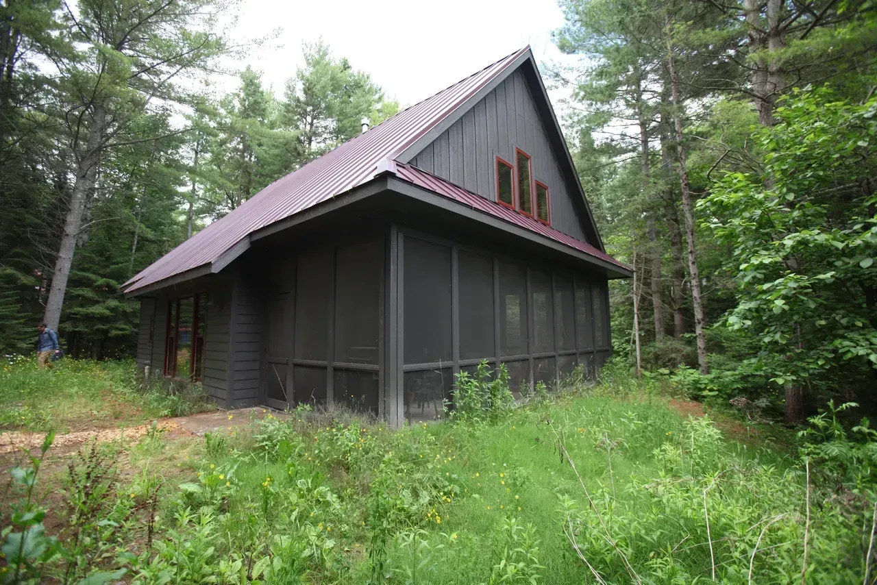 Entry view - Built on a private woodland property, this low-carbon cabin re-emerged as a quietly spectacular retreat for family and friends