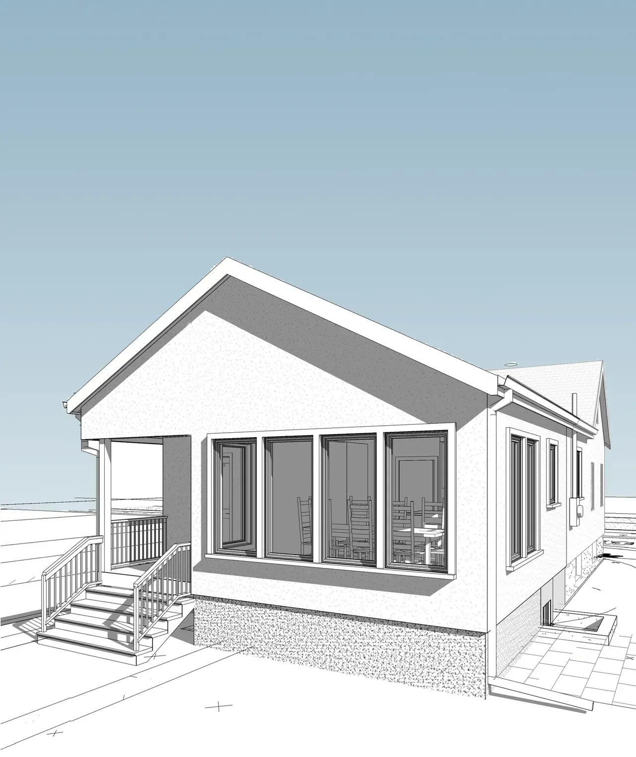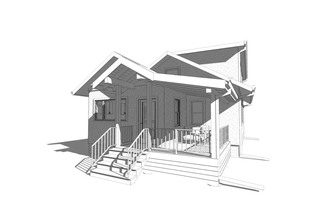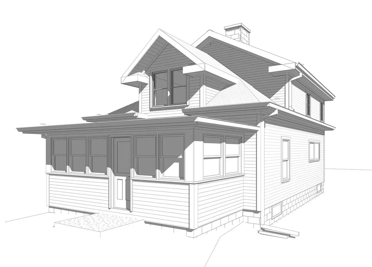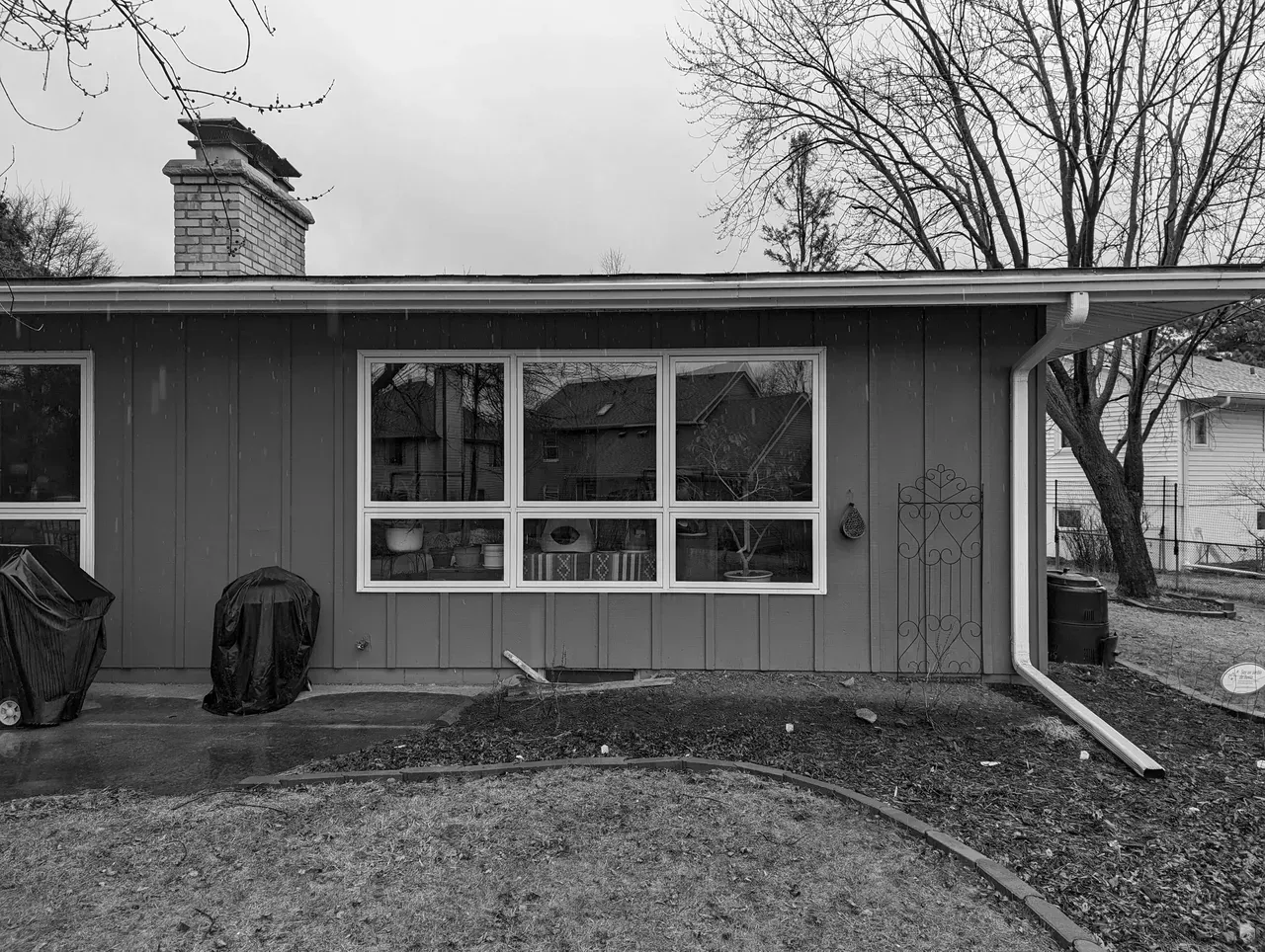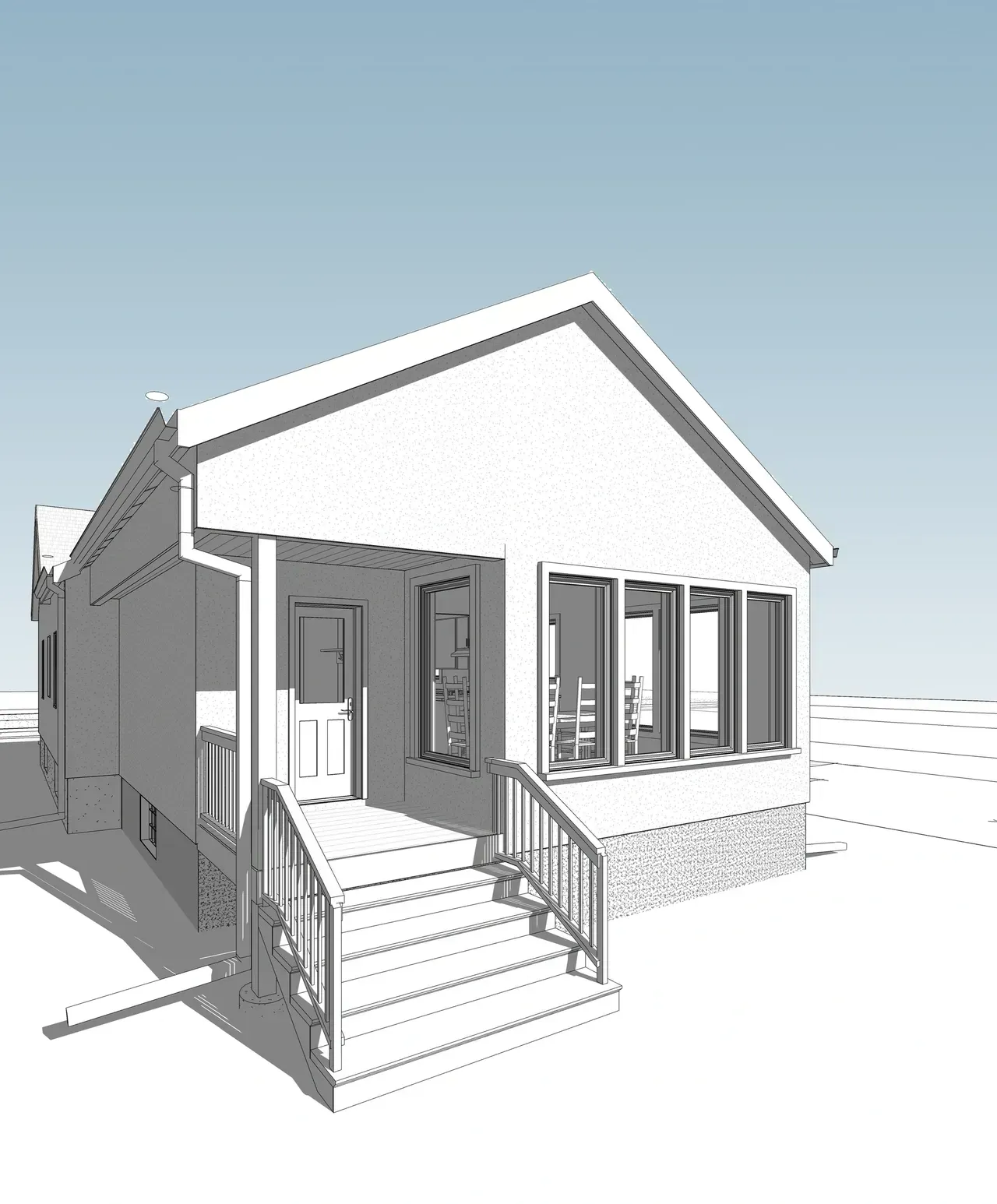 The owner challenged the architect to add "no new square footage" to this Southwest Minneapolis home. The interior was customized to an open modern retirement theme. This unique blend of styles kept the charm and scale similar to neighboring homes while opening the interior to connect spaces and capture daylight and landscape views. This view was accomplished by adding daylight with full-height windows to views and connecting rooms by adding flush beams to continue ceiling planes. A new vaulted ceiling was added over the kitchen and family room, capturing sunlight and opening a wonderful view of the integrated backyard landscaping. The final detail was the addition of a new ramp and covered entry, both of which allowed for a no-step entry as part of the overall strategy to transform this home into a living space.