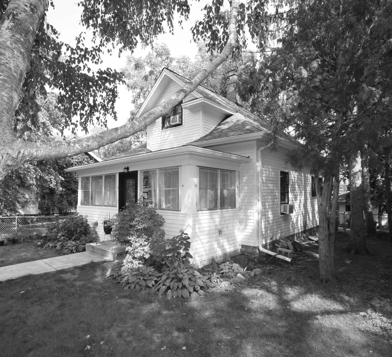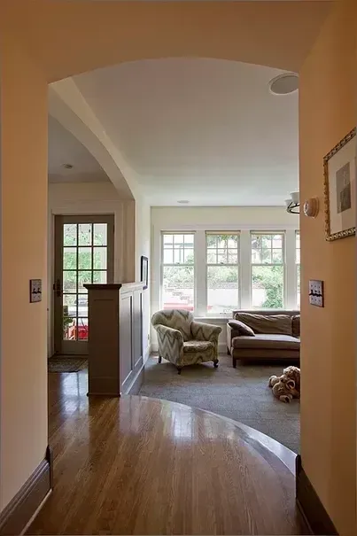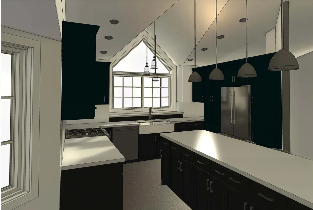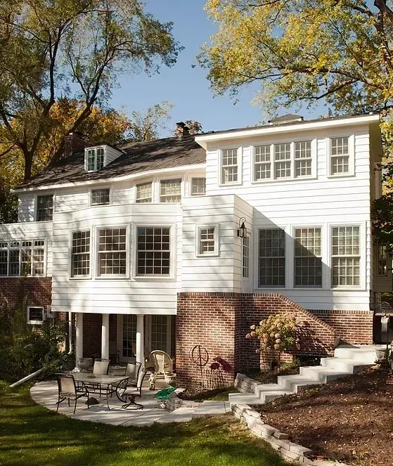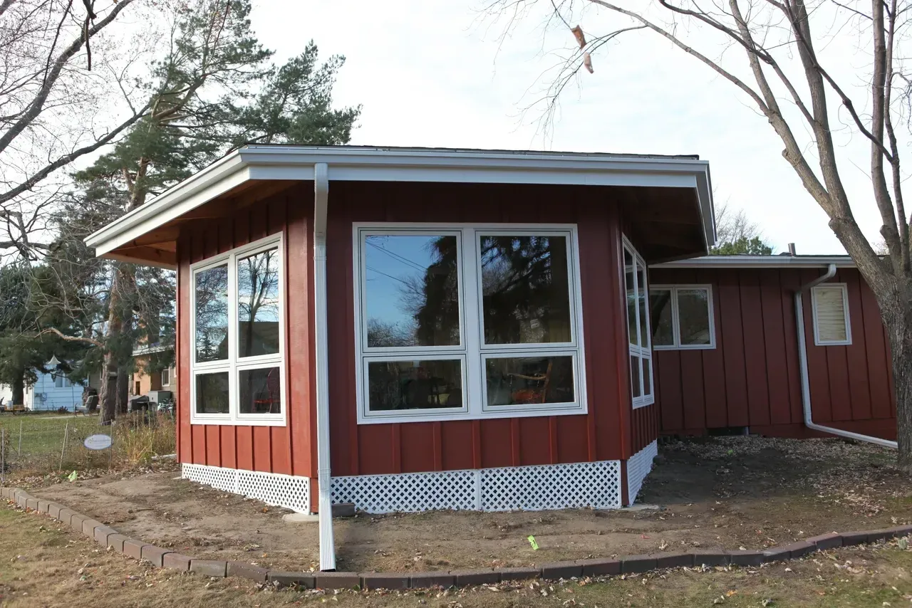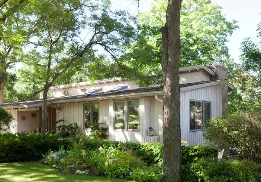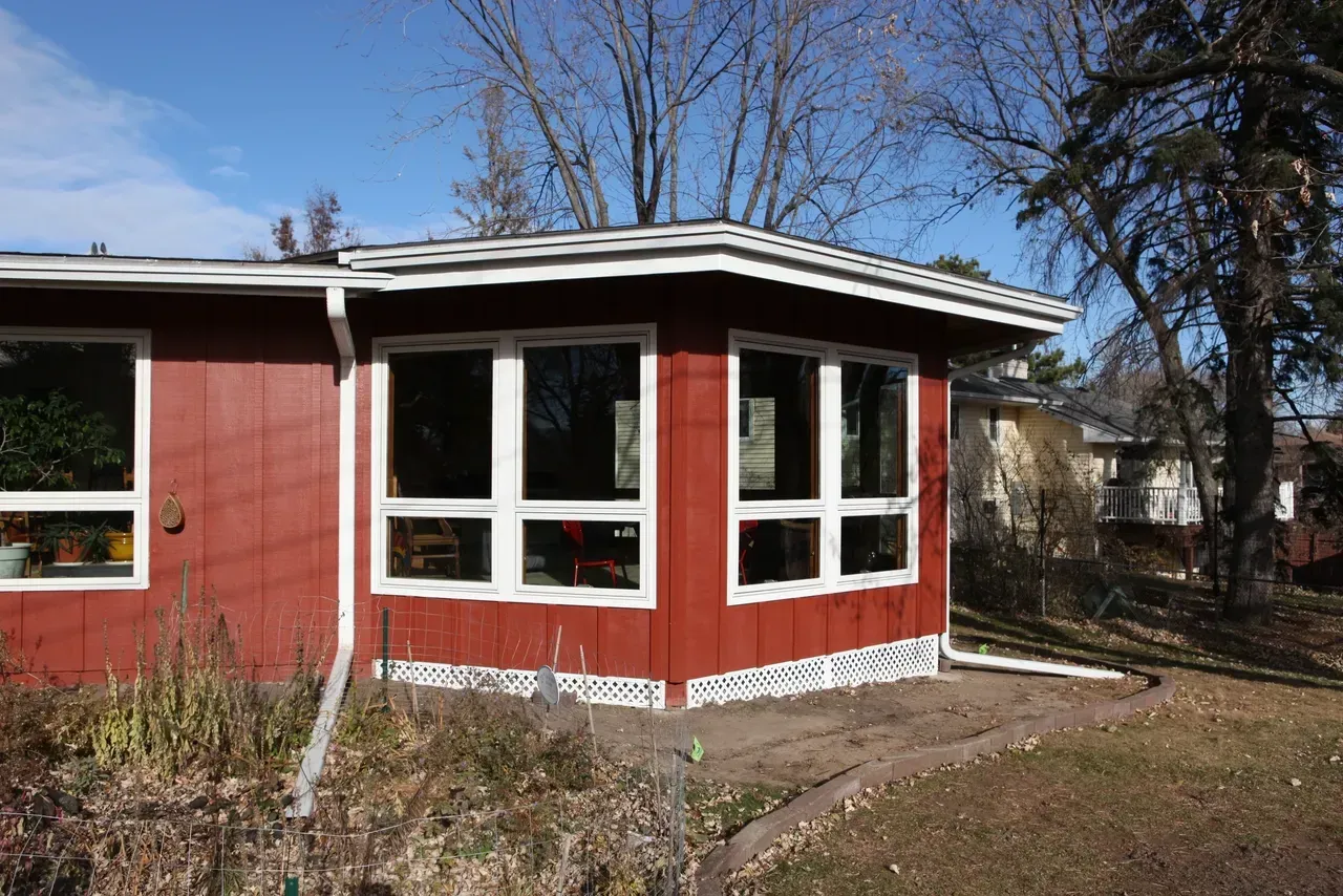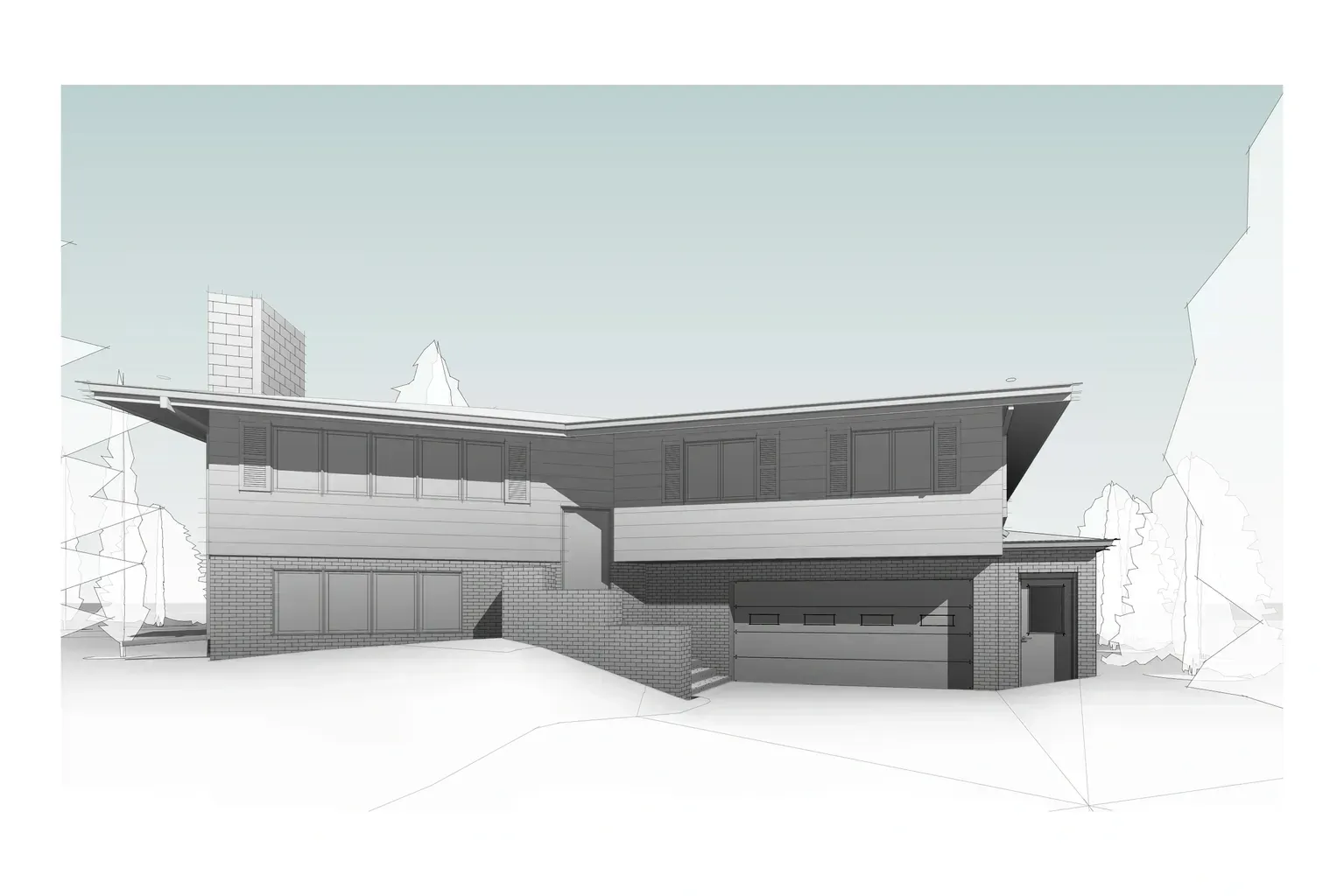 The owner challenged the architect to add "no new square footage" to this Southwest Minneapolis home. The interior was customized to an open modern retirement theme. This unique blend of styles kept the charm and scale similar to neighboring homes while opening the interior to connect spaces and capture daylight and landscape views. This view was accomplished by adding daylight with full-height windows to views and connecting rooms by adding flush beams to continue ceiling planes. A new vaulted ceiling was added over the kitchen and family room, capturing sunlight and opening a wonderful view of the integrated backyard landscaping. The final detail was the addition of a new ramp and covered entry, both of which allowed for a no-step entry as part of the overall strategy to transform this home into a living space.