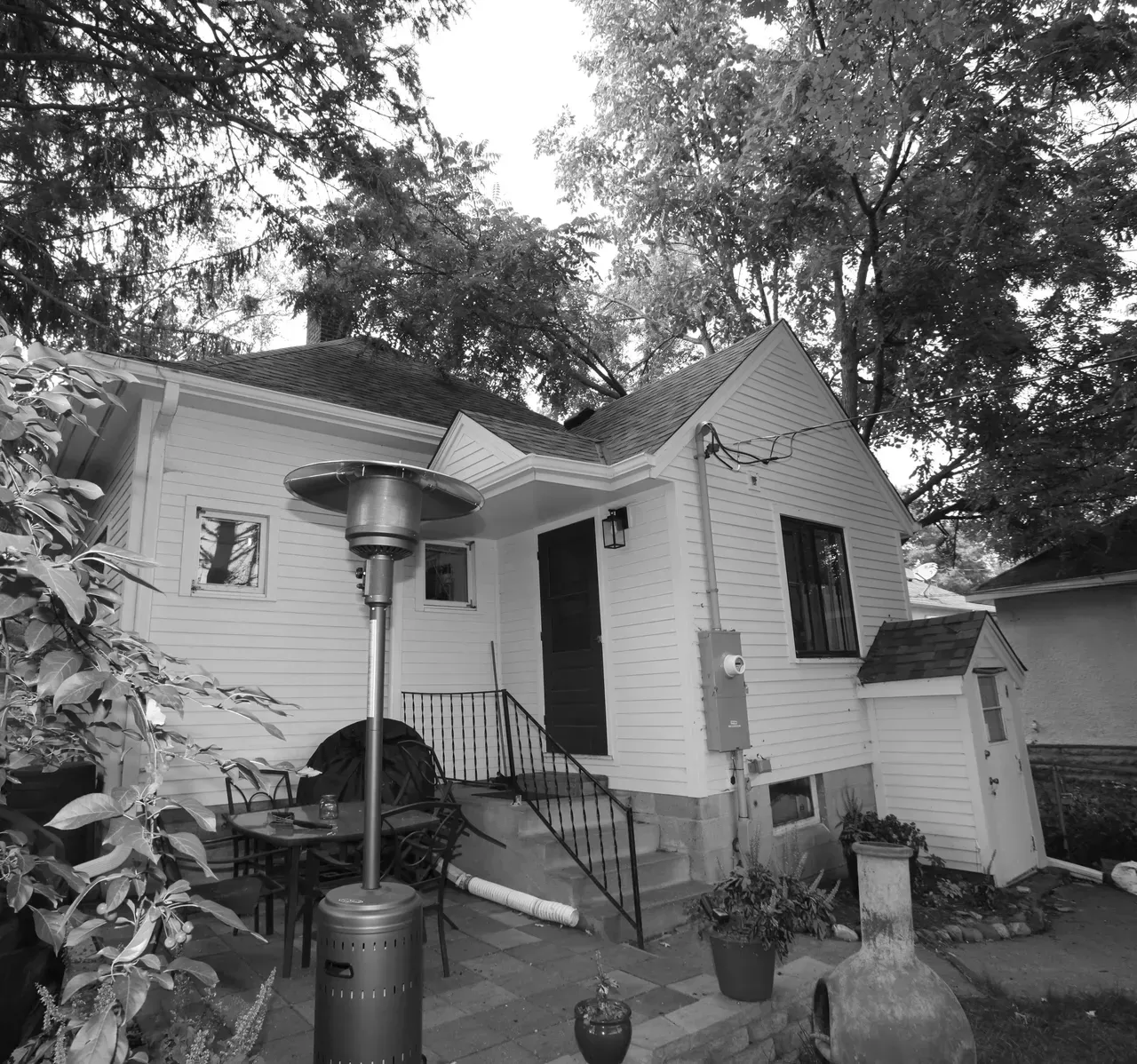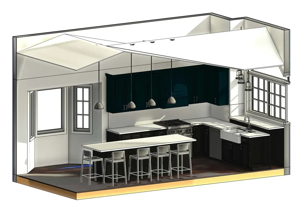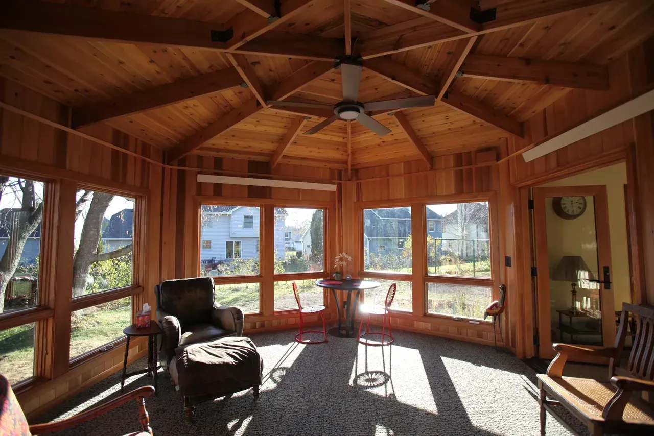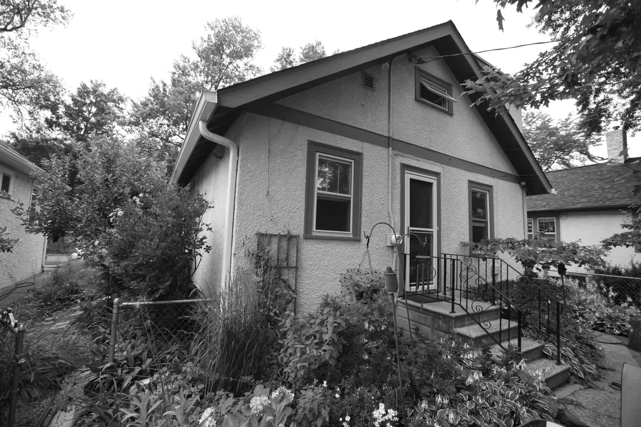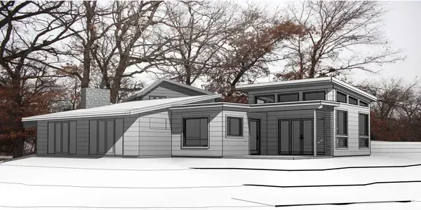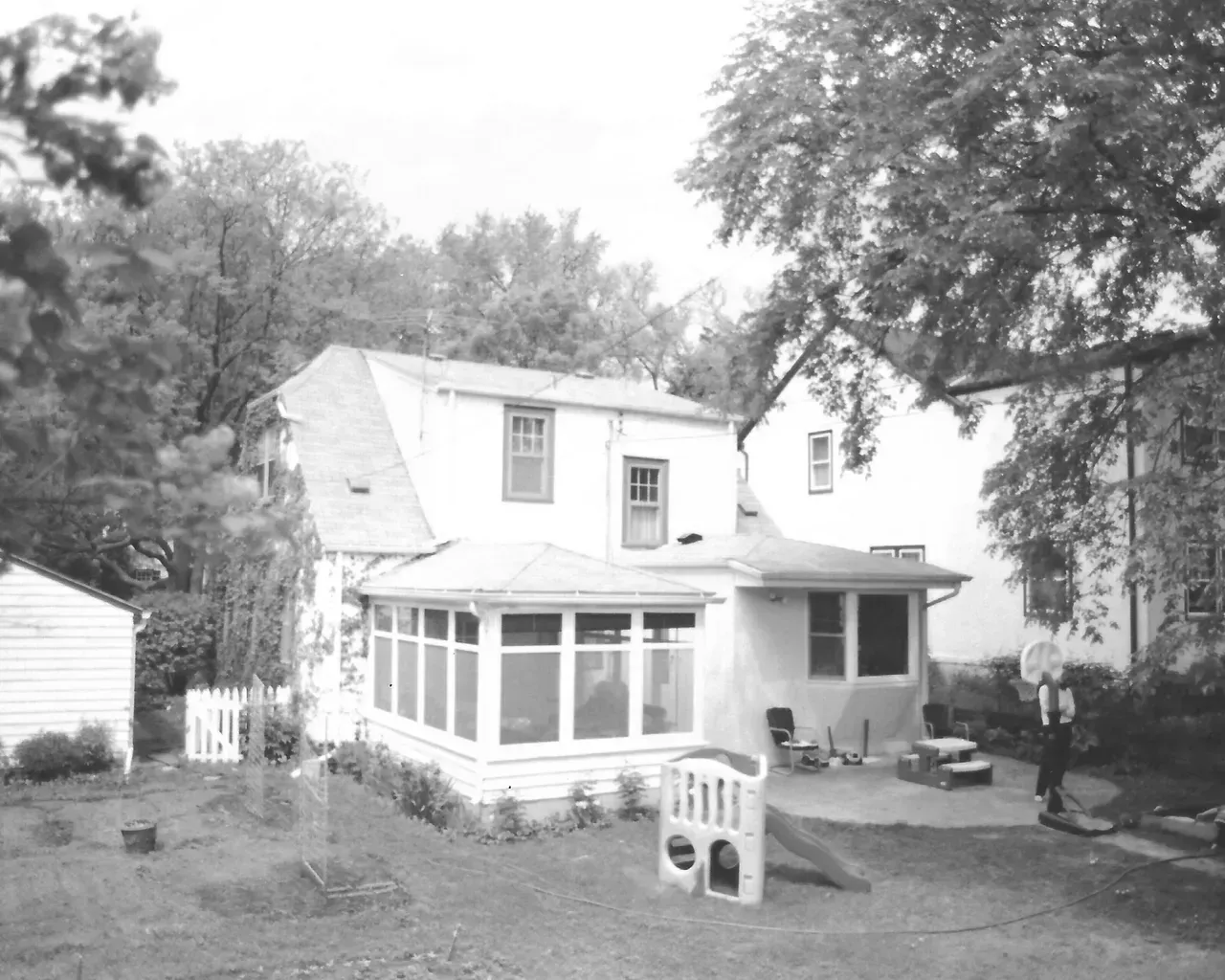 The owner challenged the architect to add "no new square footage" to this Southwest Minneapolis home. The interior was customized to an open modern retirement theme. This unique blend of styles kept the charm and scale similar to neighboring homes while opening the interior to connect spaces and capture daylight and landscape views. This view was accomplished by adding daylight with full-height windows to views and connecting rooms by adding flush beams to continue ceiling planes. A new vaulted ceiling was added over the kitchen and family room, capturing sunlight and opening a wonderful view of the integrated backyard landscaping. The final detail was the addition of a new ramp and covered entry, both of which allowed for a no-step entry as part of the overall strategy to transform this home into a living space.