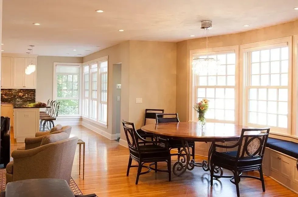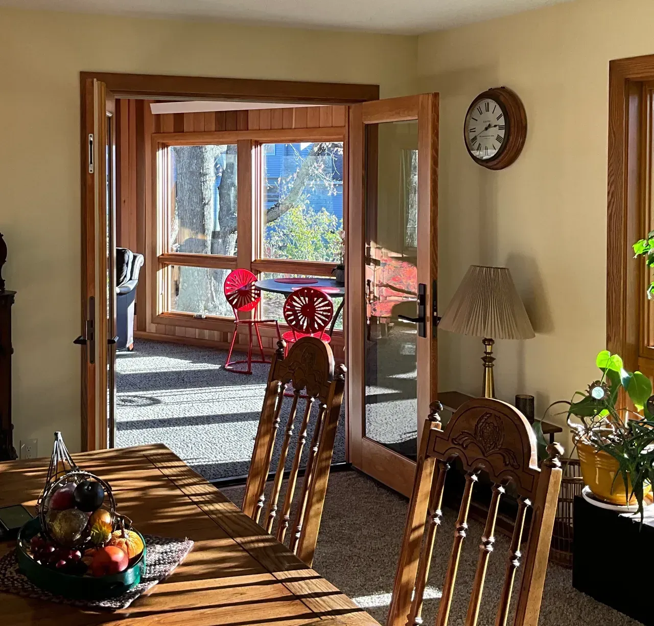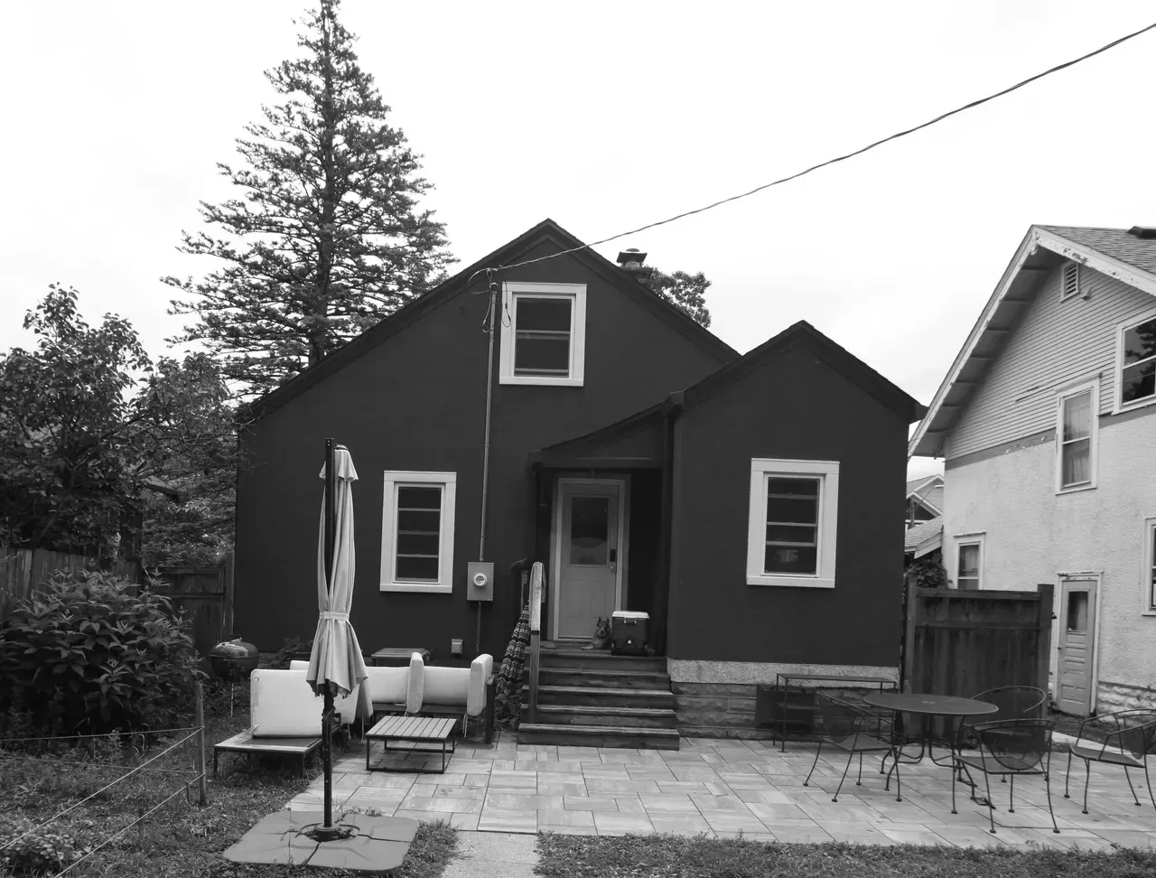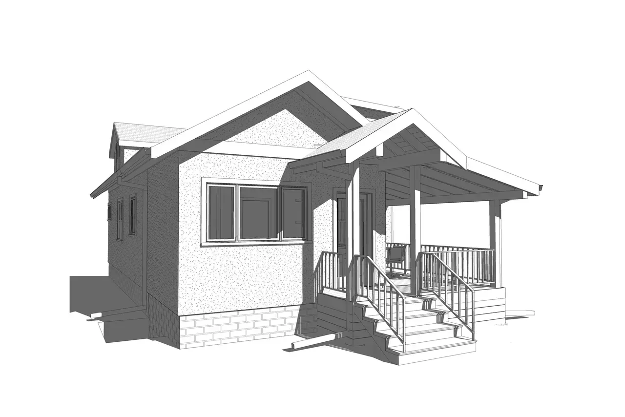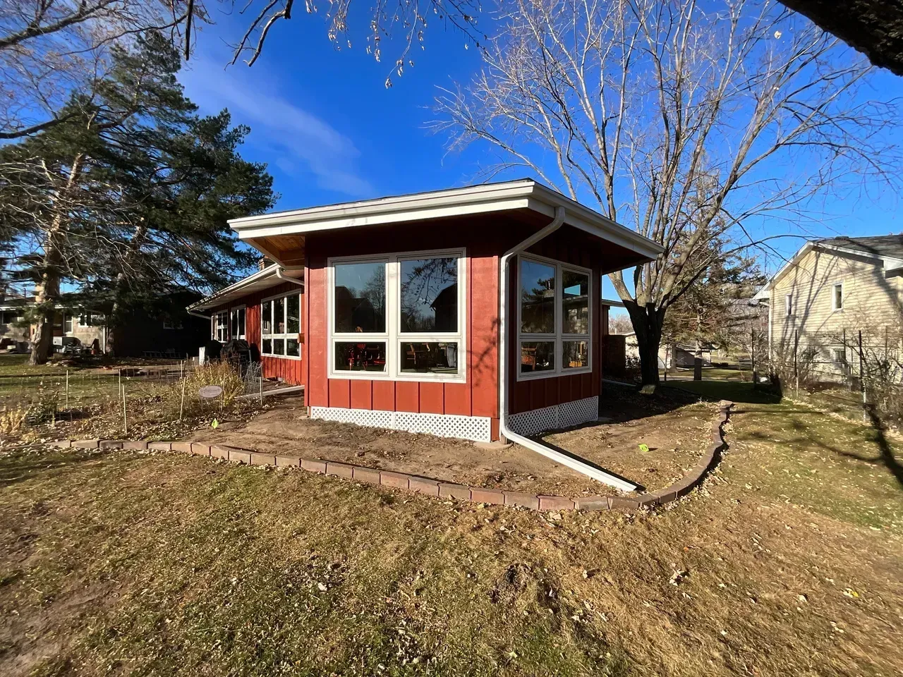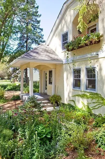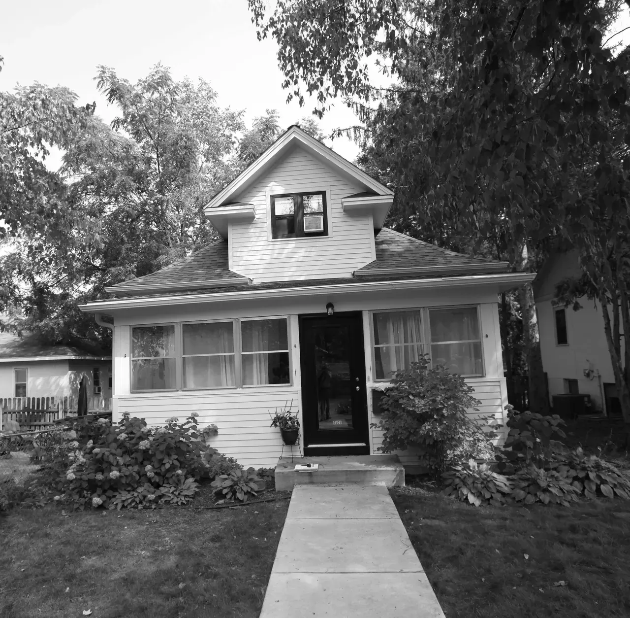 The owner challenged the architect to add "no new square footage" to this Southwest Minneapolis home. The interior was customized to an open modern retirement theme. This unique blend of styles kept the charm and scale similar to neighboring homes while opening the interior to connect spaces and capture daylight and landscape views. This view was accomplished by adding daylight with full-height windows to views and connecting rooms by adding flush beams to continue ceiling planes. A new vaulted ceiling was added over the kitchen and family room, capturing sunlight and opening a wonderful view of the integrated backyard landscaping. The final detail was the addition of a new ramp and covered entry, both of which allowed for a no-step entry as part of the overall strategy to transform this home into a living space.
