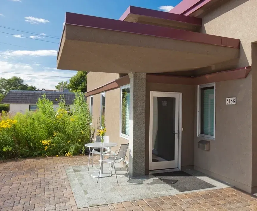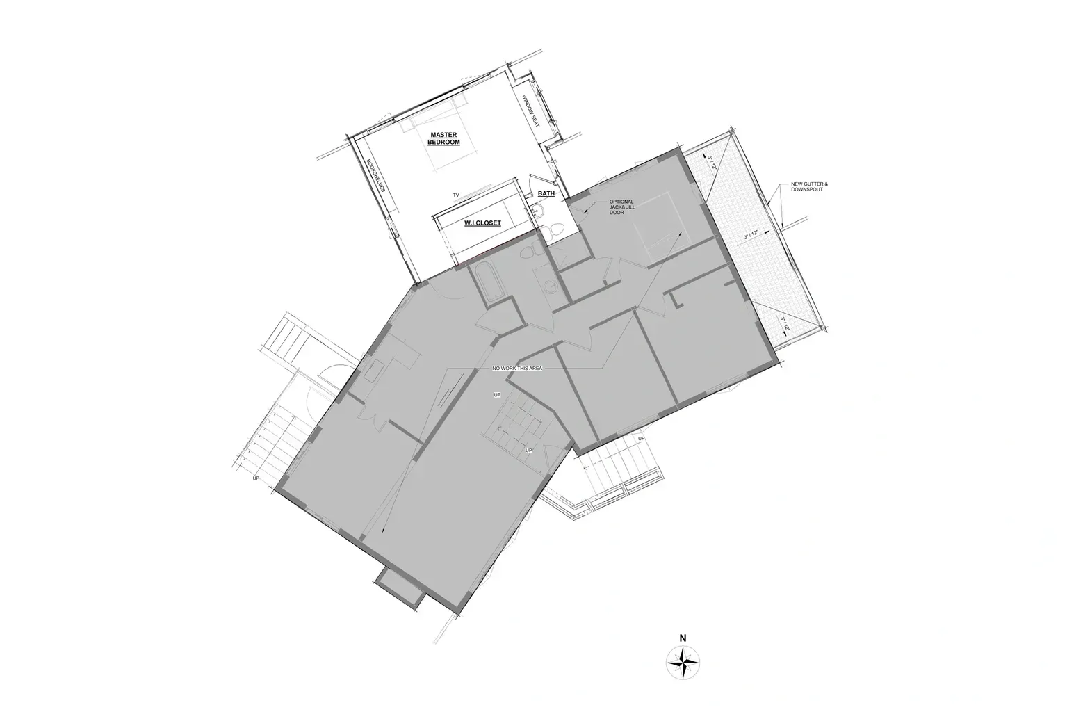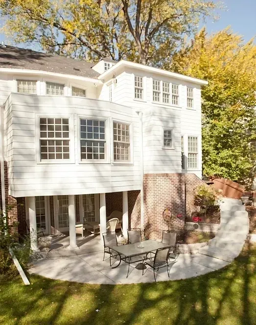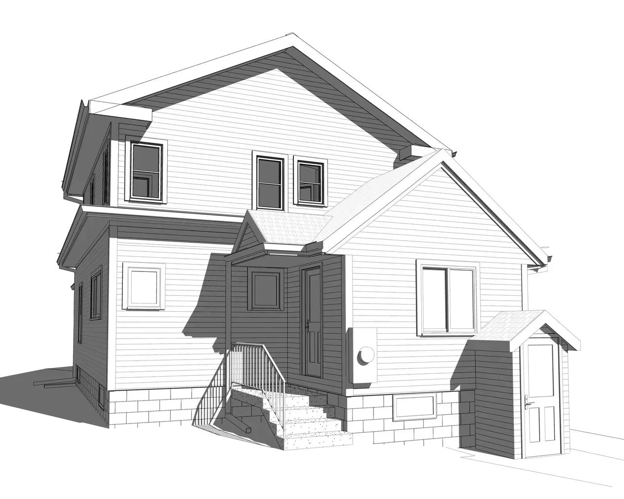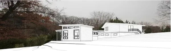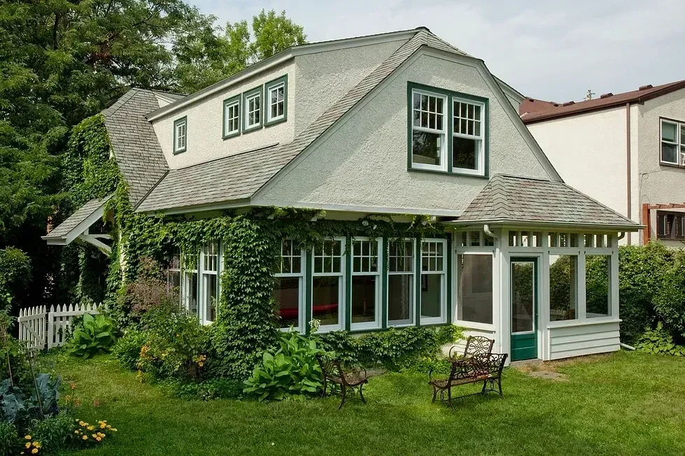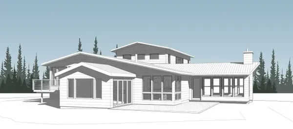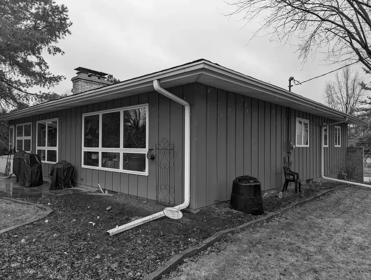 The owner challenged the architect to add "no new square footage" to this Southwest Minneapolis home. The interior was customized to an open modern retirement theme. This unique blend of styles kept the charm and scale similar to neighboring homes while opening the interior to connect spaces and capture daylight and landscape views. This view was accomplished by adding daylight with full-height windows to views and connecting rooms by adding flush beams to continue ceiling planes. A new vaulted ceiling was added over the kitchen and family room, capturing sunlight and opening a wonderful view of the integrated backyard landscaping. The final detail was the addition of a new ramp and covered entry, both of which allowed for a no-step entry as part of the overall strategy to transform this home into a living space.
