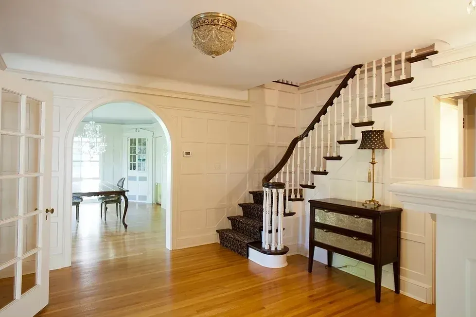 All foreground space is new to add charm to a home that had been dominated by a turnaround driveway in front—building a new garage with side yard access allowed room for luscious landscape, a covered porch, and an overall more inviting entry into the estate. The architect also integrated a new master suite with an inset balcony above the garage to create a generous living space for the couple to unwind.