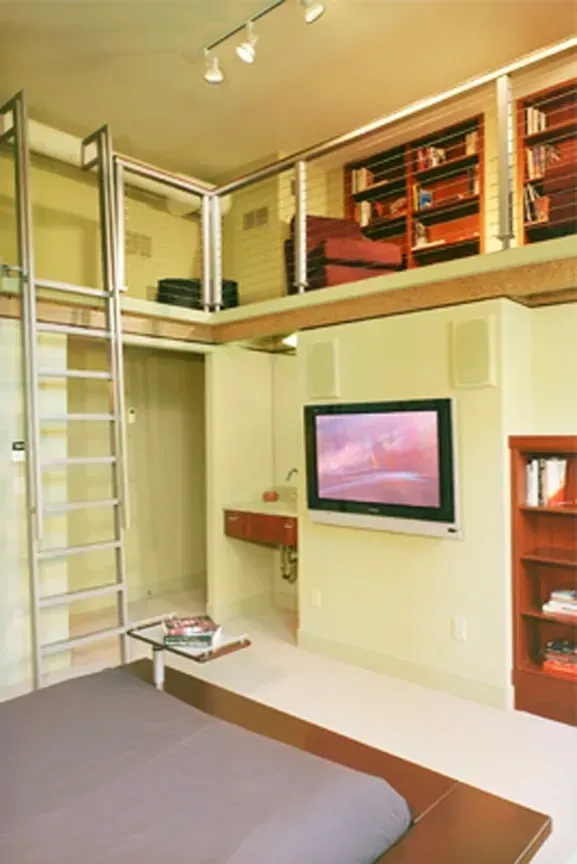 Originally a Phillips 66 gas station in South Minneapolis, this space was transformed into a modern two-bedroom home and office. The daring design and incredible execution earned this project a spot on an episode of the HBO series "Before and After." The architect incorporated exposed wood structures and transparent stains-to-match to give this unit an industrial feel. Moreover, an open balcony that doubles as a reading and study lounge was added in the high ceilings of the old car repair bay.